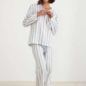 Lennie; this luxury jacquard multi-colour striped cotton classic pyjama set features a long sleeve button-up top and pants with an elasticated waistband and drawstring. Made from 100% cotton. Made ethically in Turkey. Designed locally in New Zealand.