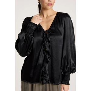 A softly structured blouse crafted from a winter-weight viscose-rayon blend with a subtle sheen. Featuring a ruffled elastic neckline and shirred cuffs, this piece offers an elevated, easy silhouette with gentle movement. Style with Calista Pant or the San Pant … Read More