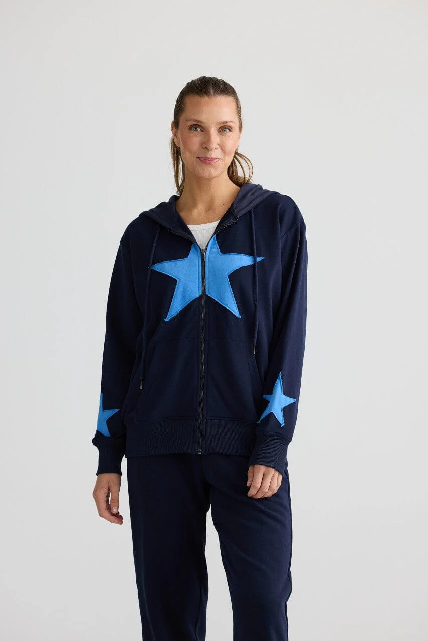 Crafted from 100% cotton, it features light blue star appliques on the front and sleeves, a cozy kangaroo pocket, and a timeless navy hue—perfect for layering on cooler days, whether you’re lounging at home or on the go.