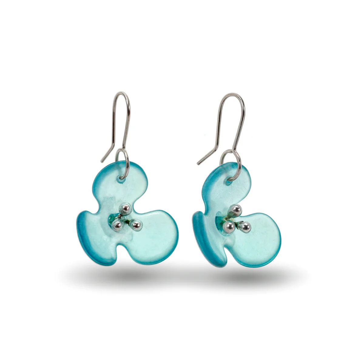 Handmade glass flower earring cut from a recycled bottle and slumped in a kiln to create a lovely three dimensional design. Finished with recycled Sterling Silver stamen and hooks with rubber stoppers for extra security.