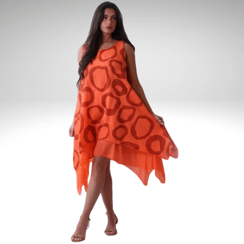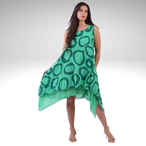 Stunning addition for the women wardrobe with all the retro vibrant circle print and high end features. Made in Italy with high quality linen that is cool and dressy. Flared finish makes it appealing and attractive. Plunging round neckline, sleeveless finish and baggy plus size fit makes it ideal to mix and match with many styles and cardigans.