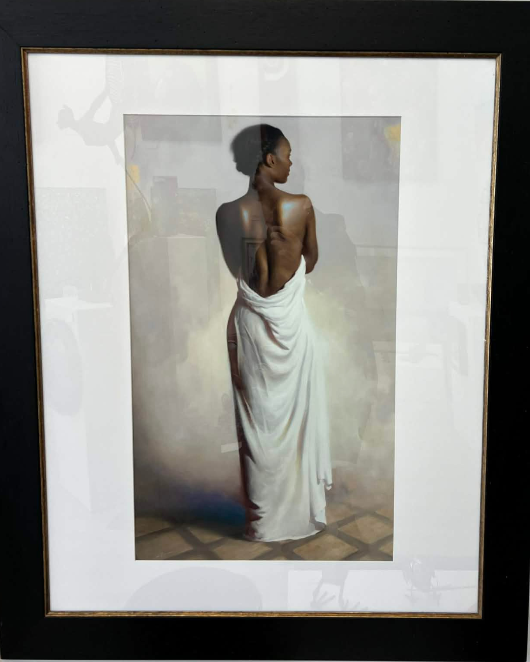 This breathtaking limited edition print of Mark Anstis’s work, “Emanation,” captures a moment of stunning, contemplative intimacy. The piece features a dark-skinned woman draped in a flowing white garment, her back turned to the viewer in a classic, powerful pose.