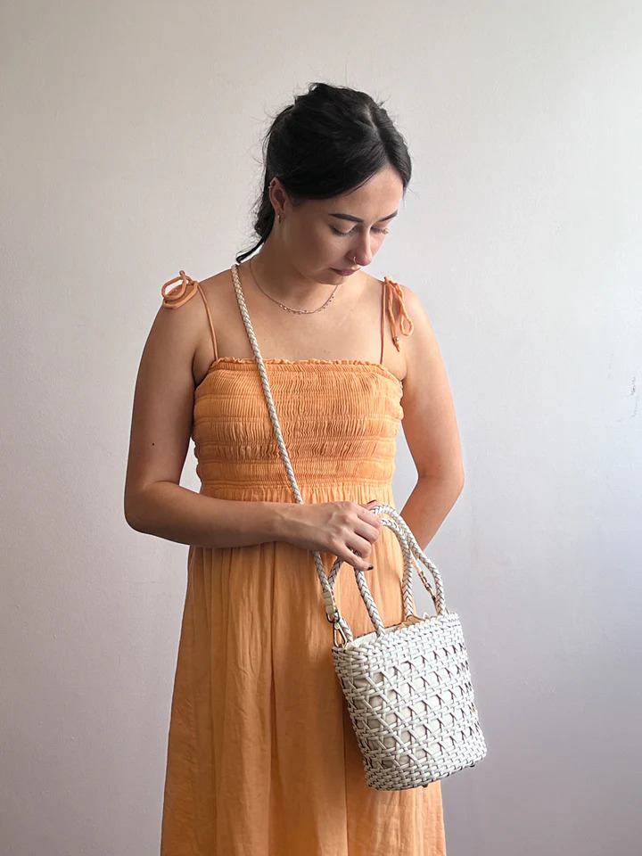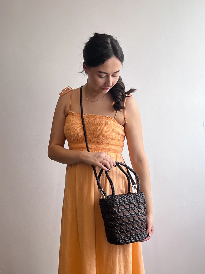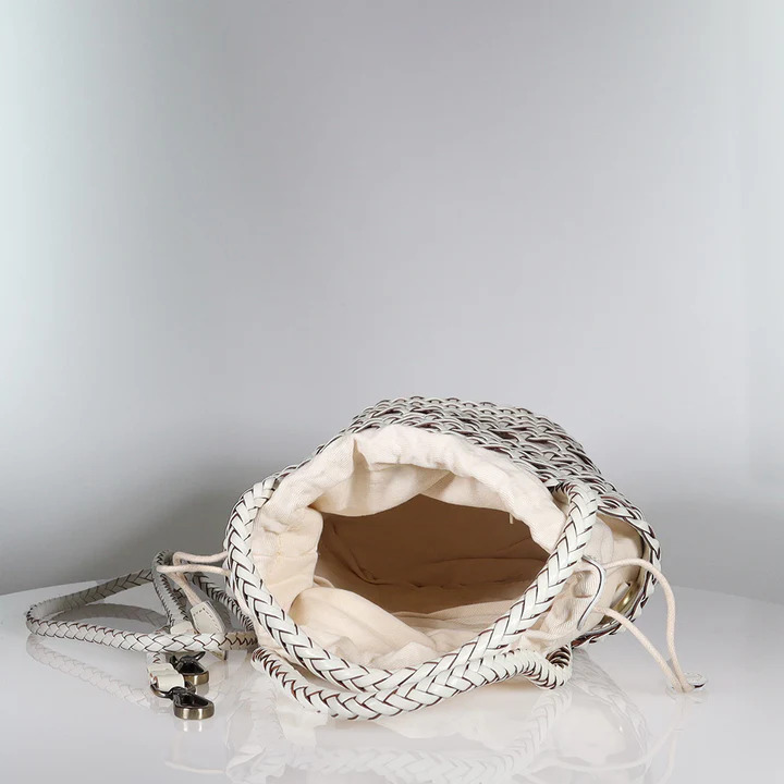 Handwoven from premium leather, the Emily in Paris Bucket Bag brings effortless Parisian charm to your warm-weather wardrobe. Available in Dark Chocolate or Ivory, its artisanal design is perfect for weekend outings and summer adventures.