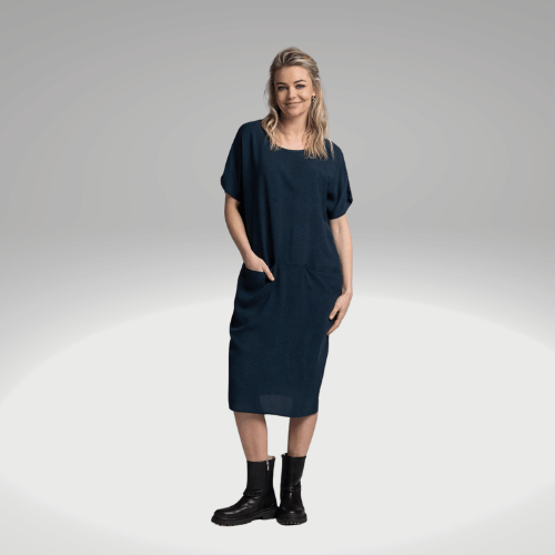 The NES Leeway dress is a subtle bat-wing tee dress sitting just below the knee. Great throw-on piece that can be dressed up or down.