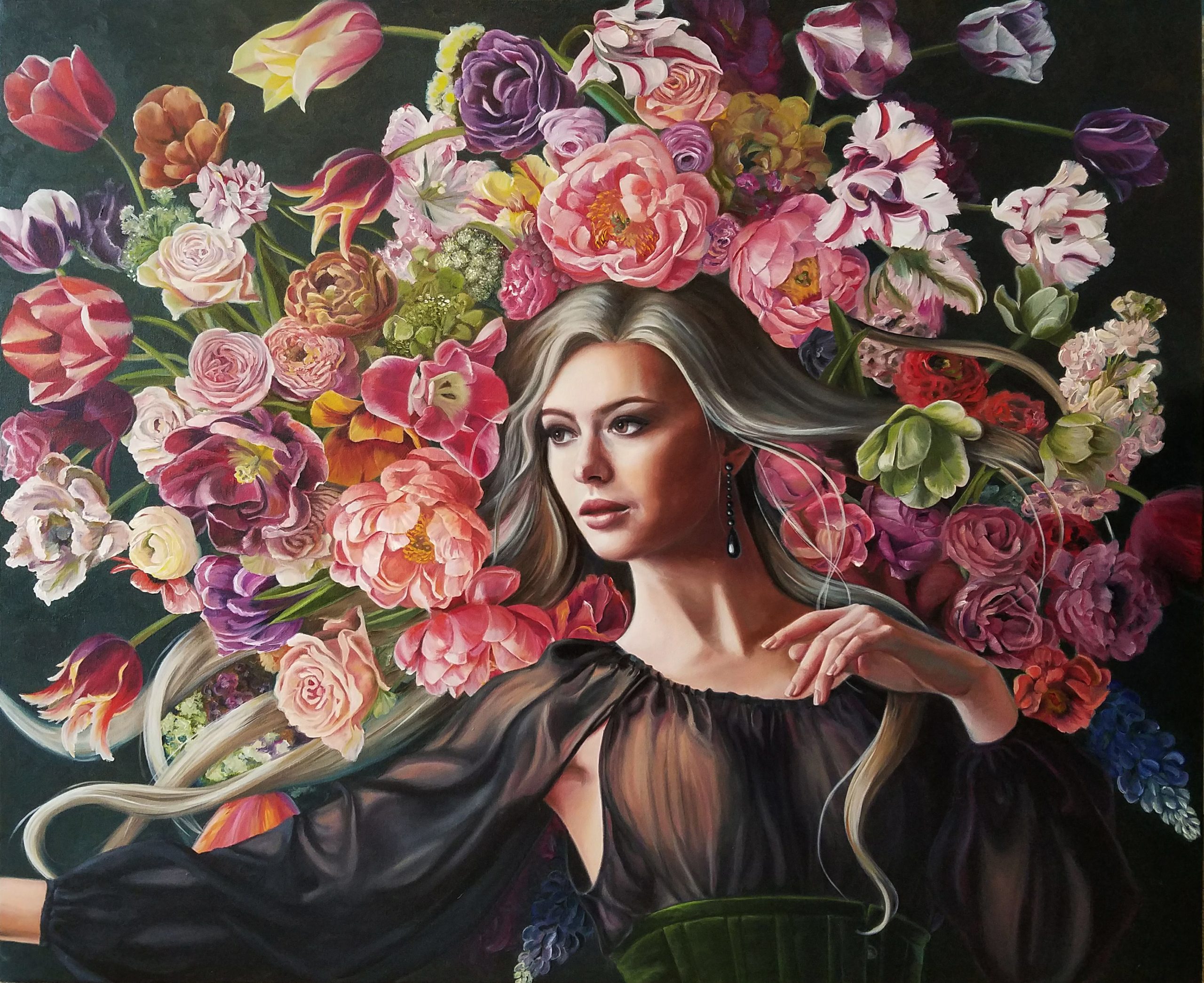 After many years of working in the fashion industry as a designer and pattern-maker, then several years of guiding tourists on the mountain trails of New Zealand’s South Island, I have been inspired by these as well as history and costume. Therefore I love painting colour, texture, fabric, nature and I love painting people. I am a self taught artist, as well as having taken private lessons with some of my much admired fellow artists