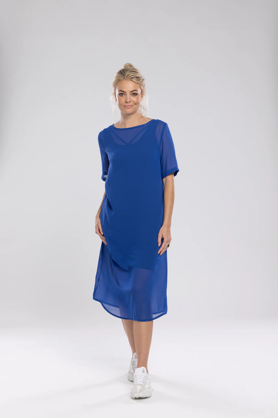 | The Olive Dress is an easy going chiffon short sleeve dress. Finished length is approx 10cm below the knee. Centre back seam detailing – creating a slimming effect. Short Sleeves. Wear a NES Lattice slip underneath.