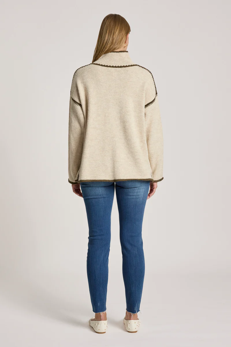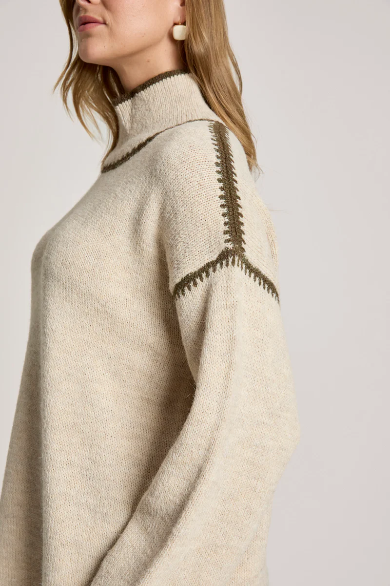 A cosy jumper featuring distinctive blanket stitch detailing. Designed with a high but relaxed neckline for warmth without feeling restrictive, this best-selling style combines comfort with modern appeal. Easy to wear and endlessly versatile.