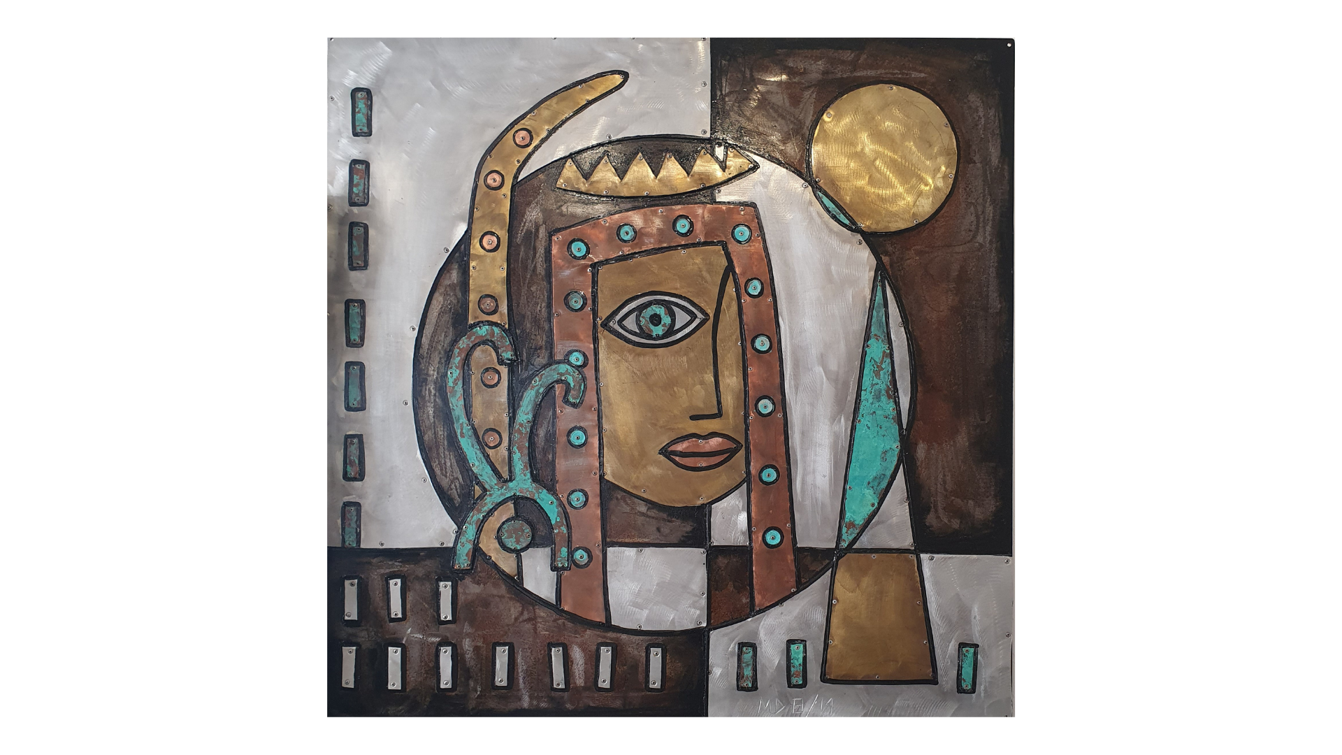 Mark’s practice is governed by the search for original imagery and a highly technical approach to his painting style. In the early 2000‘s his style changed dramatically. He started painting on rough-sawn hard wood boards. He wanted a raw look, with influences from primitive and ancient cultures such as Egyptian and Native American art. Still interested in the reflections of light playing a part in the work, he inlaid polished steel and in later works aluminium, copper and brass.
