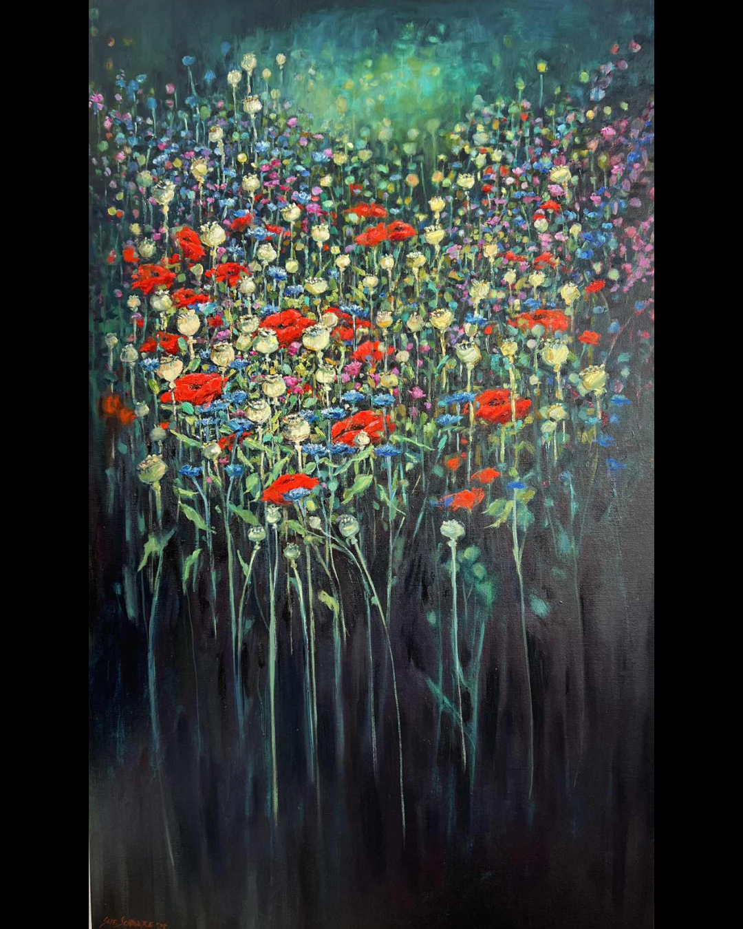 A lush field of wild blooms rises from deep twilight tones into a glow of fresh spring light. Sue Schaare layers rich oils—scarlet poppies, soft creams, and cool blues—over inky greens to create a work that feels alive and gently luminous. The tall, elegant format draws the eye upward, making it a striking statement for a living room, entry, or feature wall.