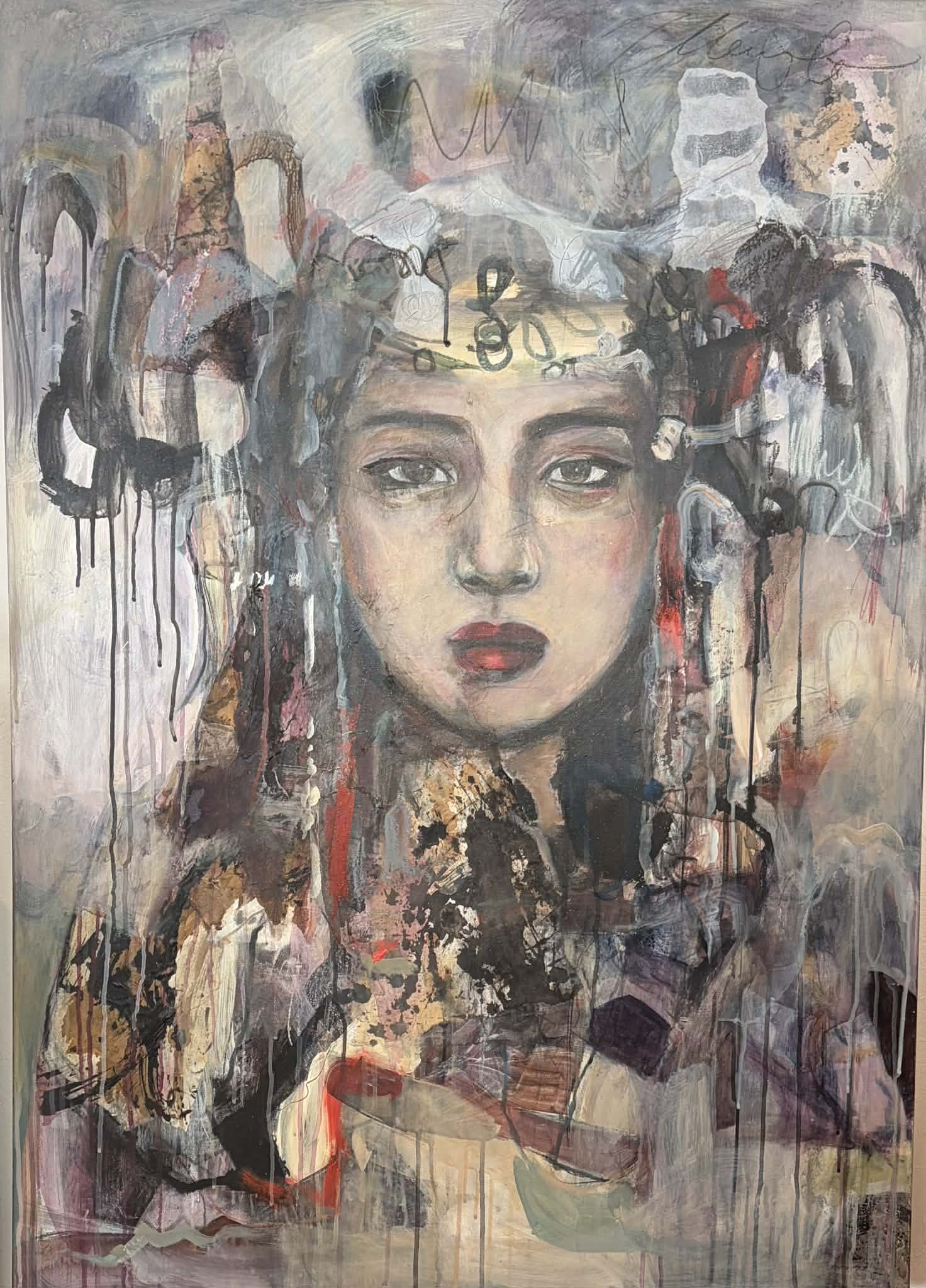 She works primarily in mixed media (using charcoal, ink, acrylic, etc.) to create textured and layered pieces. Her subjects—often faces, bodies, and landscapes—are not intended to be literal depictions, but rather “emotional terrains” that explore themes of fragility and humanity.