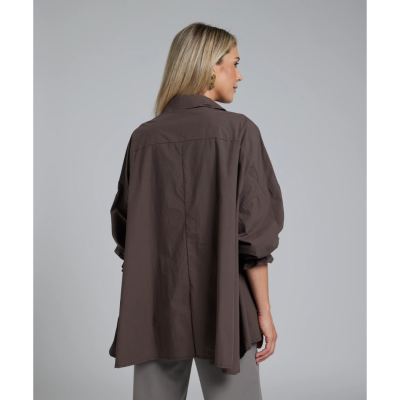 The Homestead Shirt is an elevated wardrobe staple designed with a relaxed, oversized silhouette for effortless styling. Featuring a classic collared neckline and button-up front, this piece balances structure with fluid drape. Long sleeves are finished with wide cuffs, while … Read More -