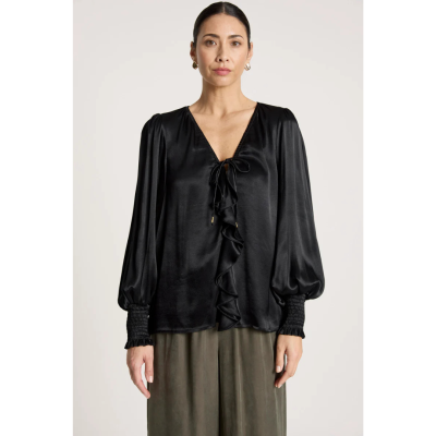 A softly structured blouse crafted from a winter-weight viscose-rayon blend with a subtle sheen. Featuring a ruffled elastic neckline and shirred cuffs, this piece offers an elevated, easy silhouette with gentle movement. Style with Calista Pant or the San Pant … Read More -