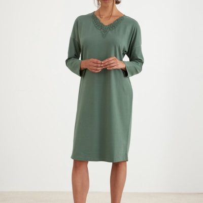 Chloe; this luxurious knit nightie features a long full length sleeve, knee length with neck lace detailing. Made from a blend of 95% cotton and 5% elastane. Made ethically in Turkey. Designed locally in New Zealand. OEKO-TEX® Certified.