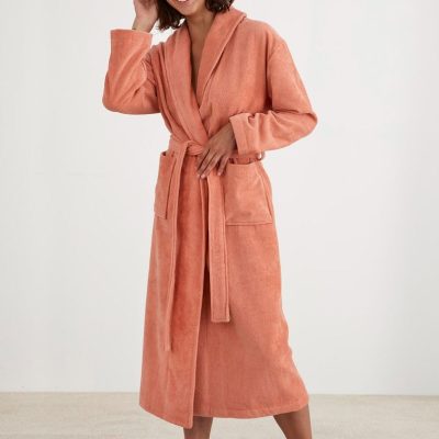 Freya; this fitted robe allows for comfort at home. Featuring a shawl collar, two pockets and a waist tie. Made from 100% OEKO-TEX® Certified cotton; velour outer, terry toweling inner. Made ethically in Turkey. -