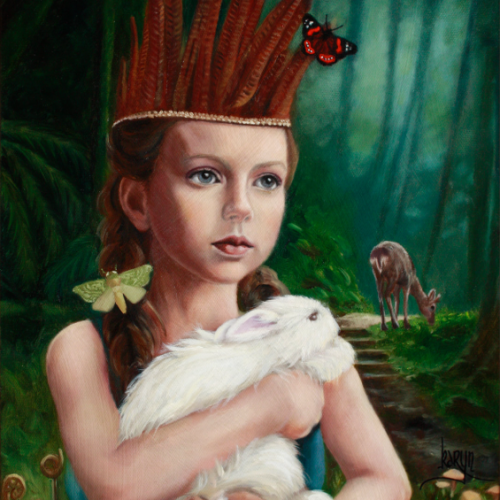 Sylvi (from the house of strength)’ Little girl with her bunny in the forest. Butterflies adorn her hair and feather crown. A make-believe world. Children’s imaginations become a reality. Print 33cm x 25cm With border 40cm x 27.5cm Limited Edition -
