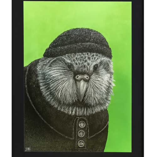 The Kuzzie Kākāpō in GreenMedium: Acrylic & InkFramed | Vivid Green BackgroundArtist: Jason McDonald Size: 8250mm x 6250mm Bold, humorous, and sharply detailed, The The Kuzzie Kākāpō in Green reimagines the rare New Zealand native bird with unexpected personality. Dressed … Read More -